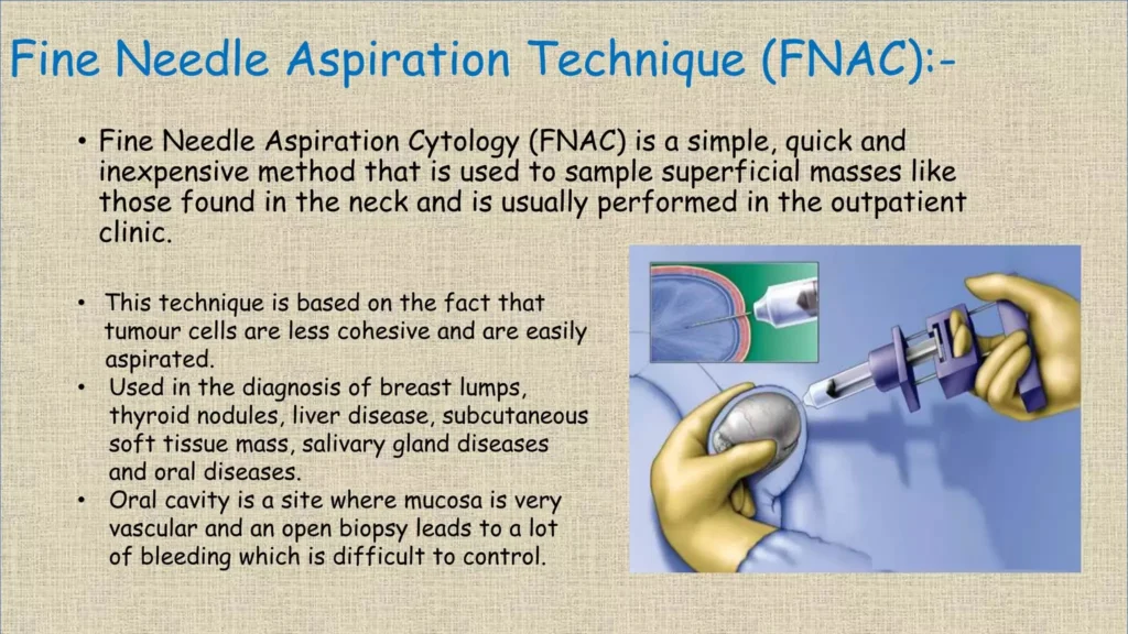 The FNAC test is when doctors use a thin needle to take some cells from a lump or a weird bump, on your body. They then look at these cells under a microscope to see what is going on with the FNAC test results. The FNAC test is pretty simple. It helps doctors figure out what the lump or bump is so they can decide what to do next about the FNAC.