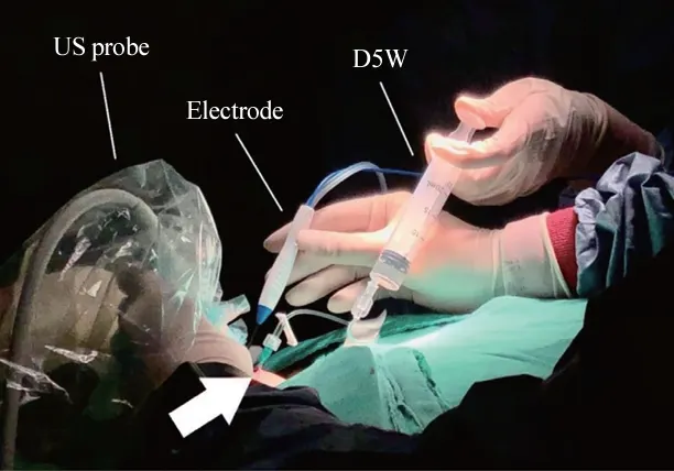 First doctors use ultrasound to find the nodule and see what is around it. They need to do this because the thyroid gland is very close to the nerves that help you talk and the blood vessels. Then they put a needle or probe into the skin and, into the nodule. They use a kind of energy to treat the thyroid nodule tissue in a very careful way. They do this in a pattern to make sure they get the thyroid nodule tissue they want to treat.